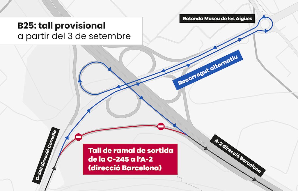 Des del 3 de setembre i durant aproximadament dos mesos, la sortida de la C-245 cap a l’A-2 sentit Barcelona romandrà tallada per les obres de la nova B-25. Com a alternativa, els conductors podran utilitzar la rotonda de la B-2001, a l’altura del Museu de les Aigües, per continuar cap a l’A-2.